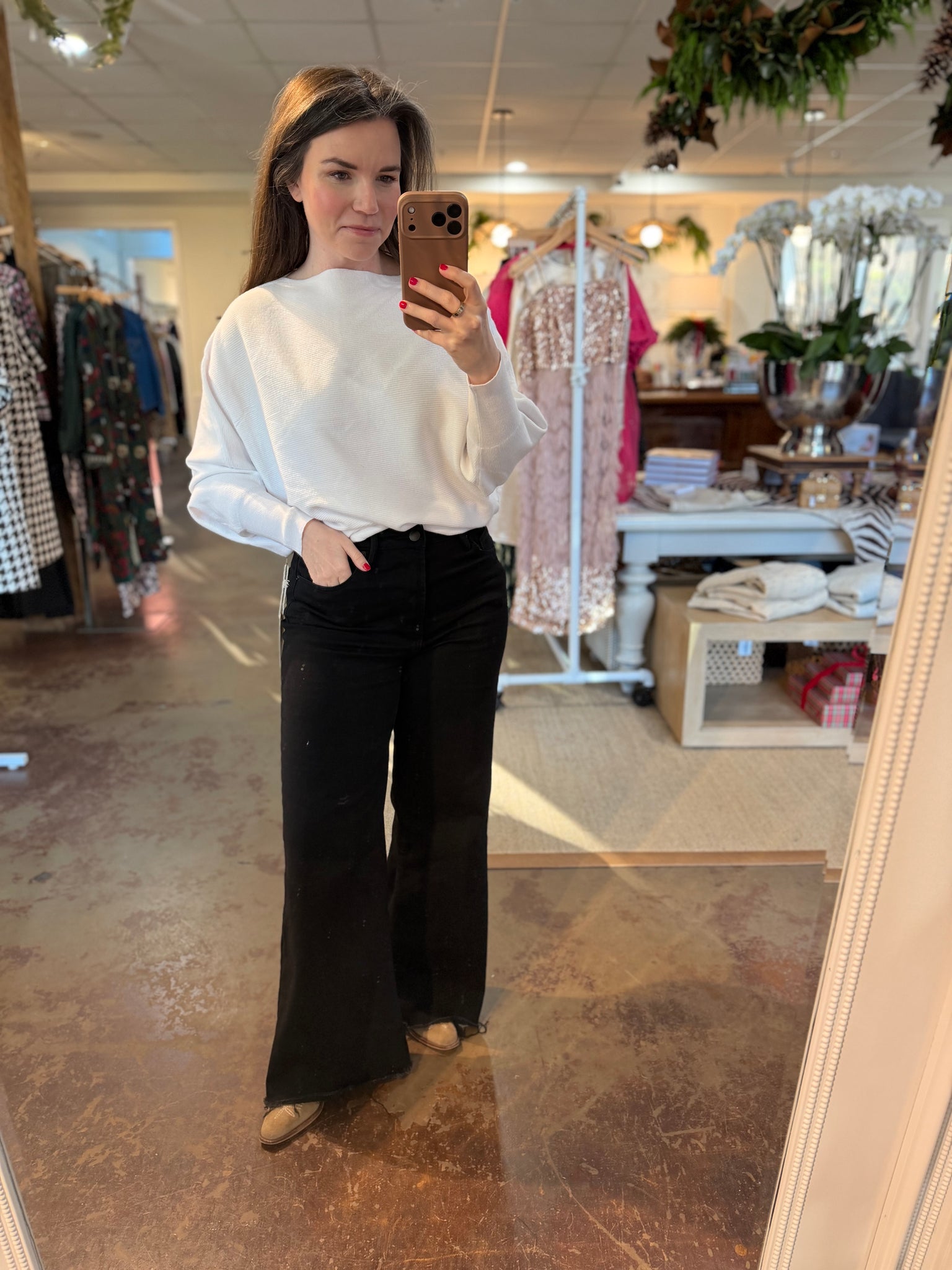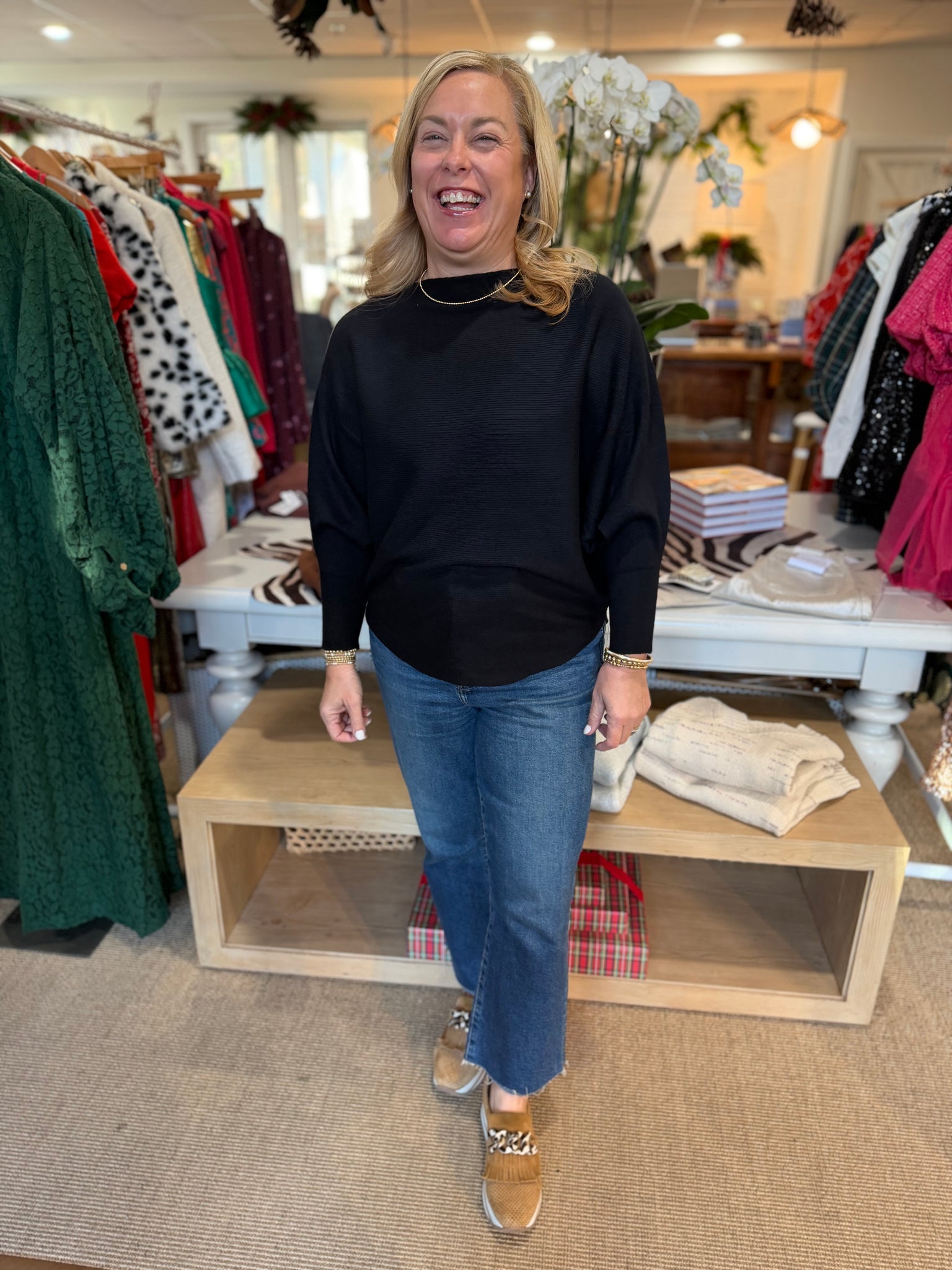 Ribbed boatneck sweater with slight dolman sleeves- super soft and easy for tucking into high waisted skirts + pants (viscose, nylon, polyester)