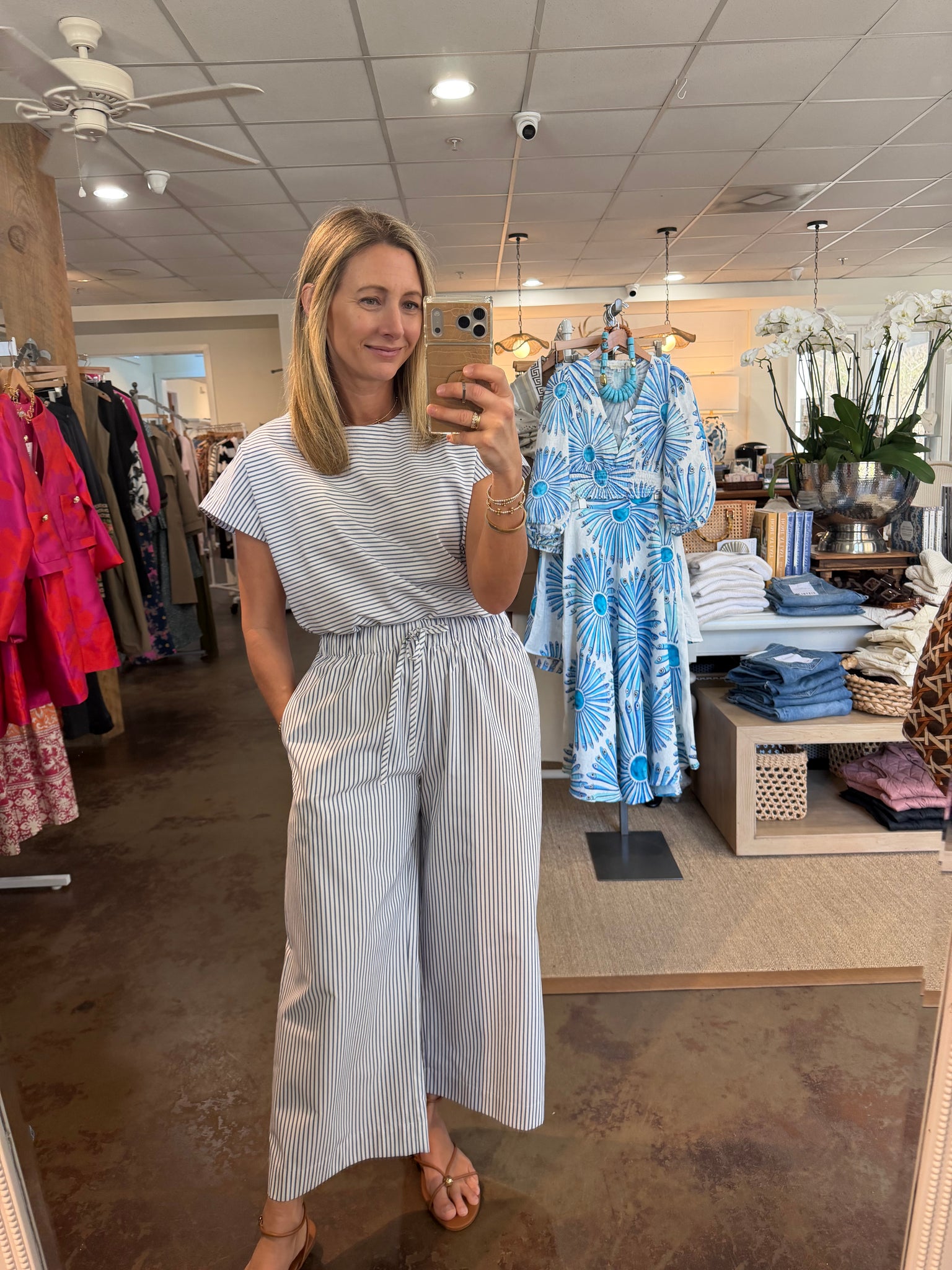 The Maya pant is made from 100% cotton poplin in a fresh navy stripe. This classic pull-on style features an easy drawstring waist and a wide leg silhouette that is slightly cropped. For reference, a size small measures 24.75 inches.
