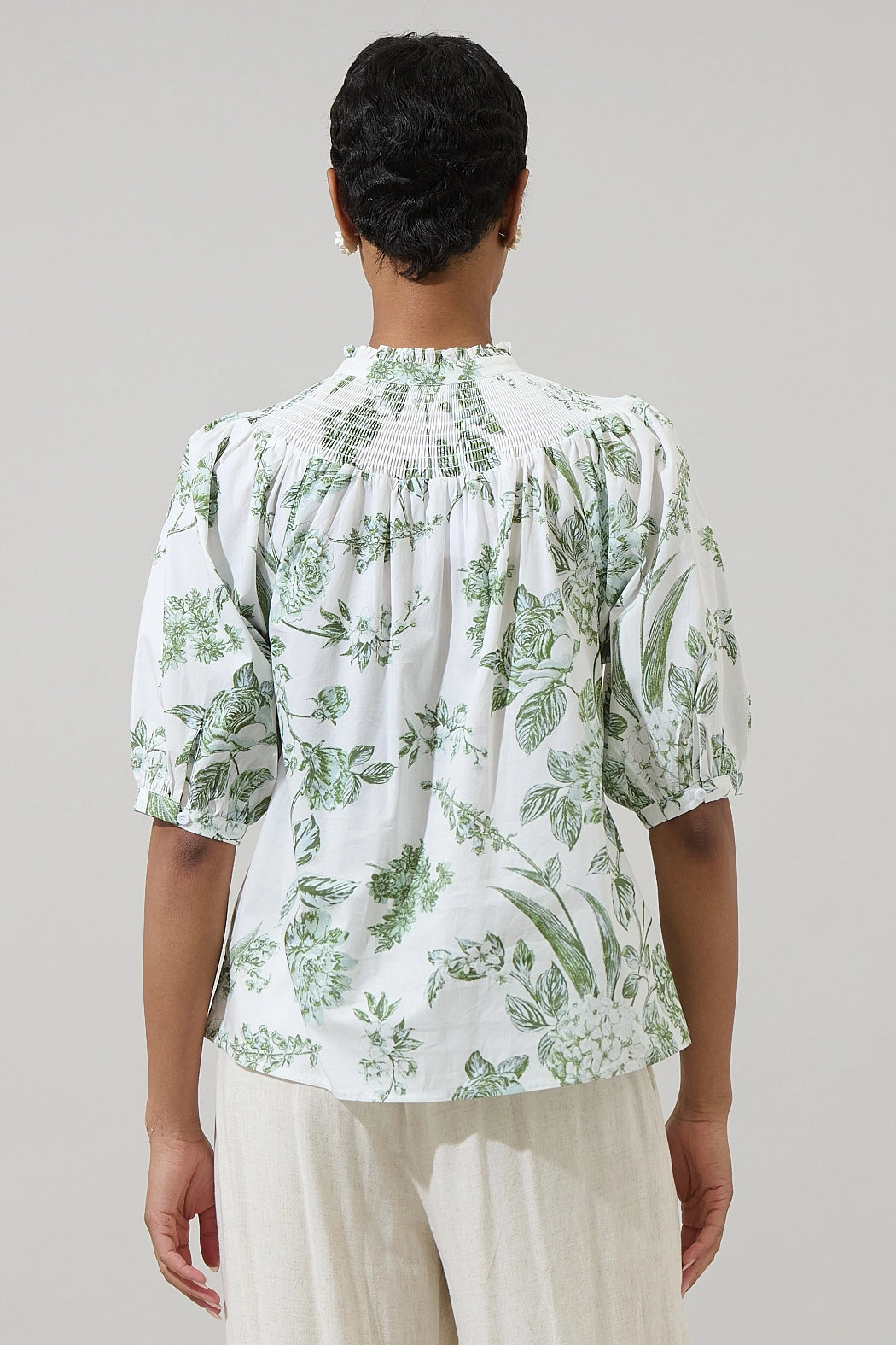 Smocked - Button front - Lightweight - Puffed sleeves - Color: Wht Olives  Size + Fit - Model is 5'9" and wearing size XS - Measurements taken from size S - Chest: 21 1/4" - Length: 25"