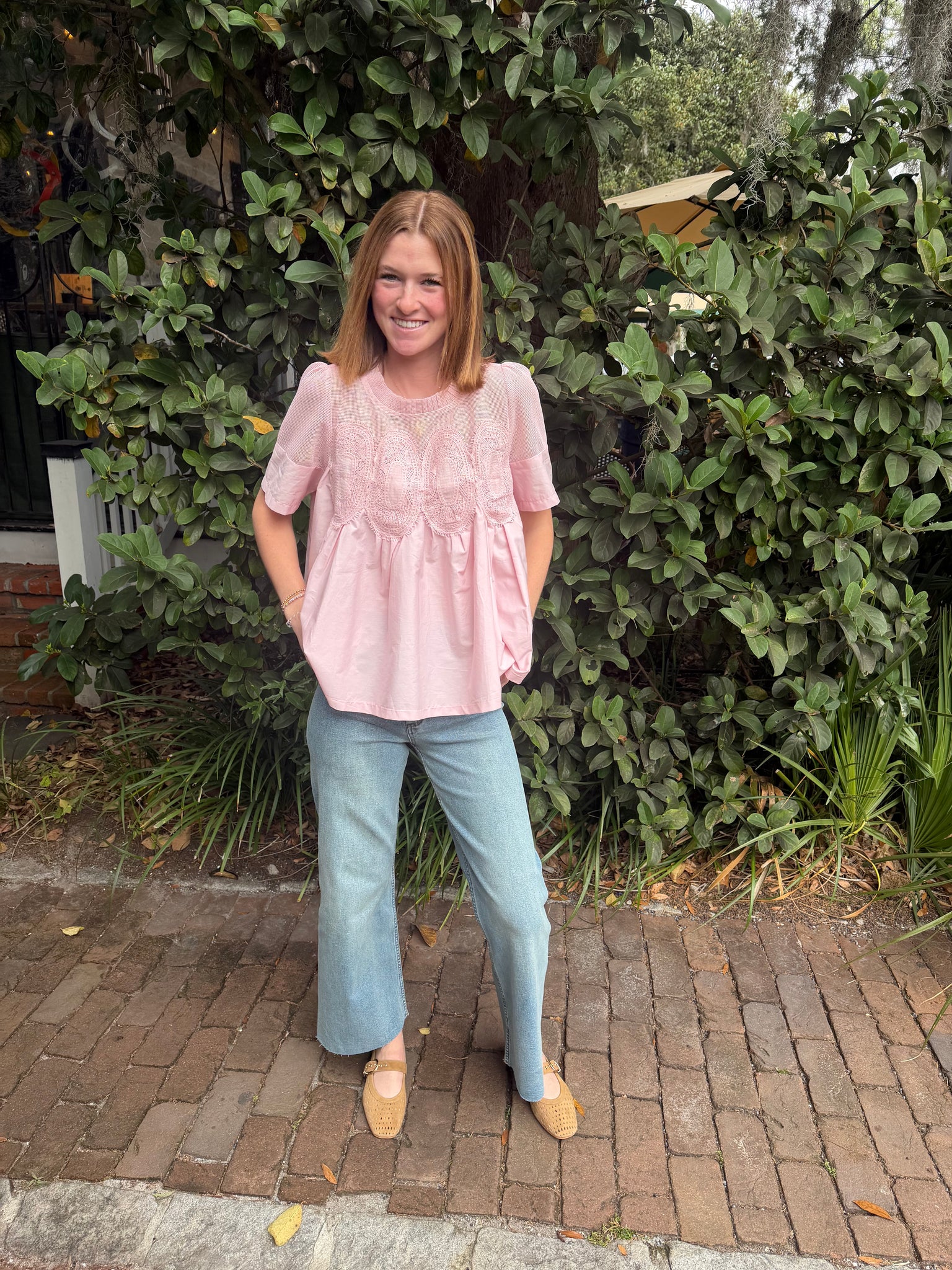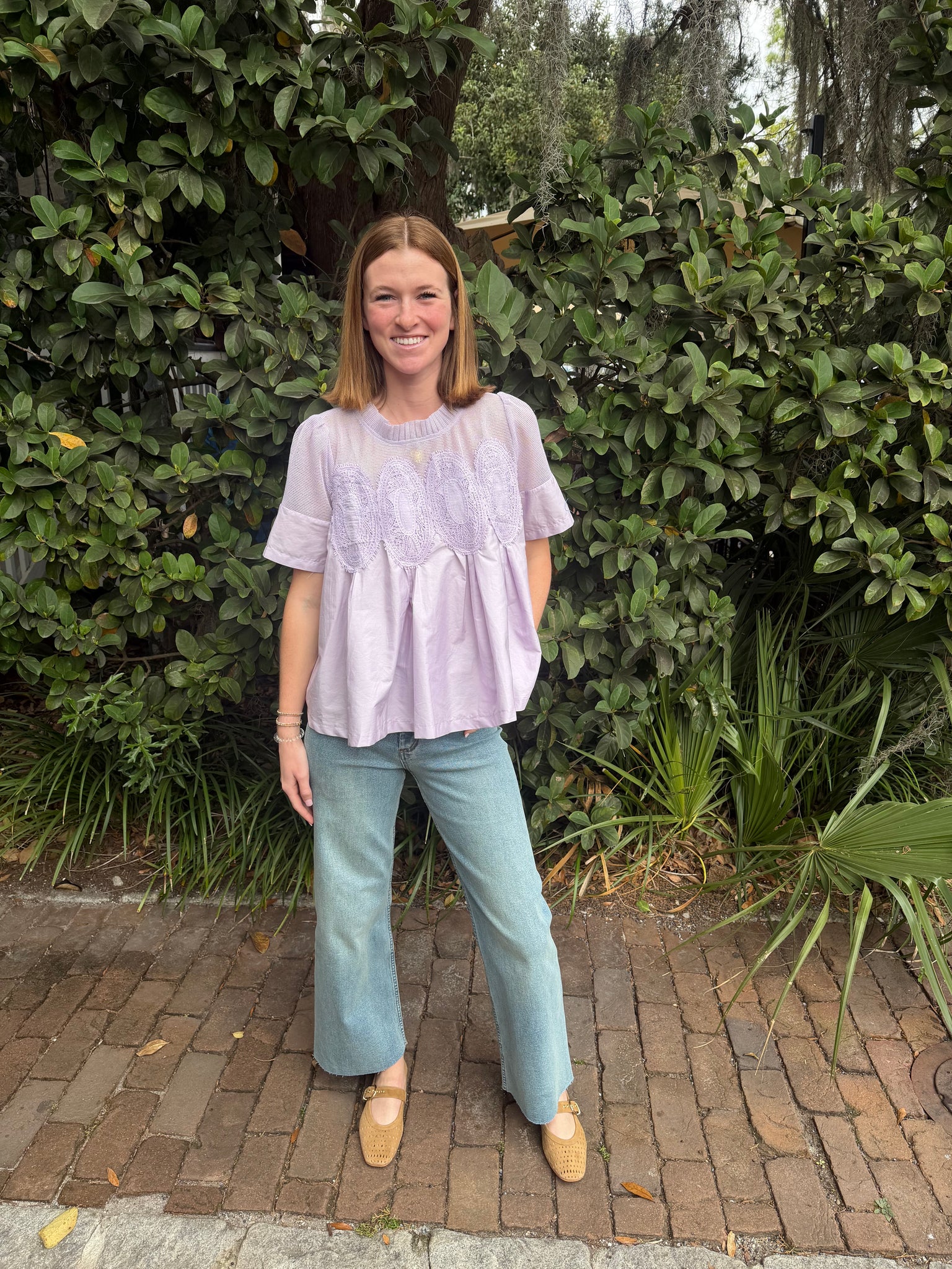 Short sleeve top with sheer netting at neckline; wearing the S
