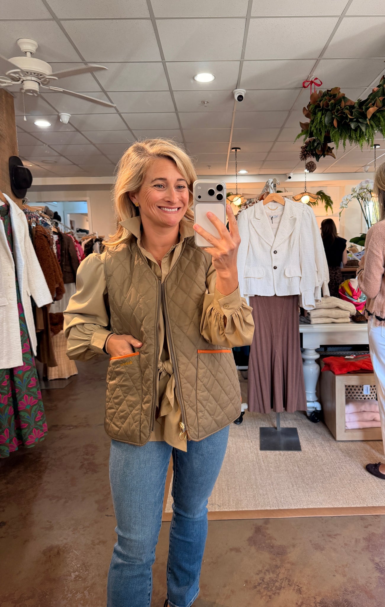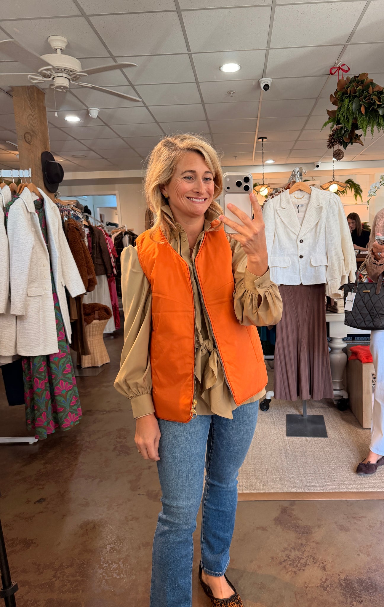 Fits true to size OR size up. Reversible vest- quilted taupe on one side, burnt orange on the other.